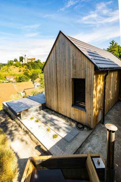Die technisches Ausstattung ist funktional und klar strukturiert: Die Beheizung erfolgt über Infrarot ergänzt durch Standard Elektroinstallationen. Auf eine Lüftungsanlage wurde bewusst verzichtet. Für den sommerlichen Hitzeschutz sorgen hochwertige Raffstores. Insgesamt wurden rund 20 cbm Holz verbaut - ein klares Statement für nachhaltiges und ökologisches Bauen.