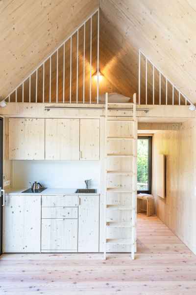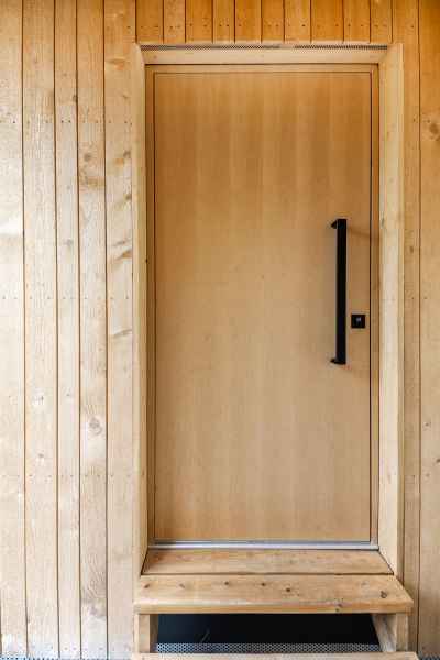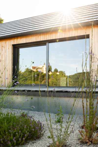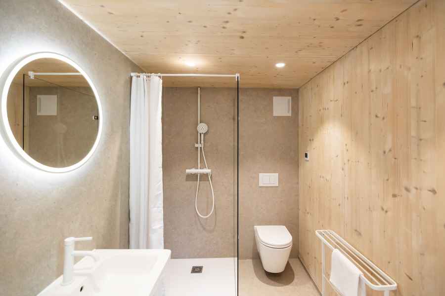 Die technisches Ausstattung ist funktional und klar strukturiert: Die Beheizung erfolgt über Infrarot ergänzt durch Standard Elektroinstallationen. Auf eine Lüftungsanlage wurde bewusst verzichtet. Für den sommerlichen Hitzeschutz sorgen hochwertige Raffstores. Insgesamt wurden rund 20 cbm Holz verbaut - ein klares Statement für nachhaltiges und ökologisches Bauen.