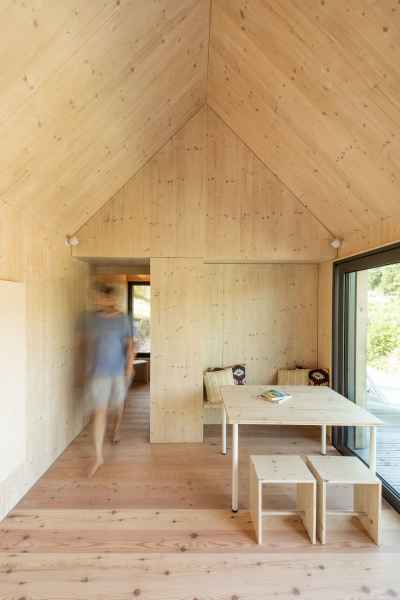 Auch im Innenausbau spiegelt sich die klare Bekenntnis zum Werkstoff Holz wieder. Helle Holzwandverkleidungen, stimmiger Kieferholzparkett und Massivholzmöbel zeigen die Konsequenz. Die Terrasse aus Douglasienholz erweitert den Wohnraum nach außen und rundet das Gesamtkonzept harmonisch ab.