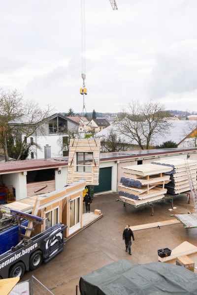 Ein besonderes Merkmal des Projekts ist der hohe serielle Vorfertigungsgrad. Das komplette Dachgeschoss inklusive der großzügigen Loggien wurde in den Produktionshallen von Holzbau Semmler weitgehend vorgefertigt. Dank dieser präzisen Planung und Ausführung konnte die Montage der Holzbauelemente vor Ort innerhalb von nur zwei Wochen abgeschlossen werden. Dadurch wurden Bauzeit, Lärm- und Staubbelastungen deutlich reduziert – ein entscheidender Vorteil, da der Gasthof während der Bauphase weiter betrieben wurde.